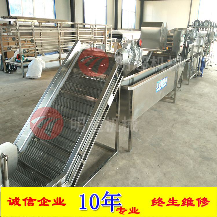 6.漂燙冷卻線:根莖類切制的是土豆、紅薯、蓮藕、茄子、黃瓜、蔬菜、山野菜等等,比如土豆切成絲后,里面的纖維收到破壞,跟空氣結(jié)合可使土豆絲變黑,有類似情況的蔬菜,都需要進(jìn)行漂燙冷卻生產(chǎn)線,針對蔬菜如果沒有這種情況的這道工序可以不用,具體還要看情況而定,漂燙冷卻生產(chǎn)線主要是采用水浴式,水可達(dá)到0-100攝氏度以內(nèi),對果蔬進(jìn)行漂燙、殺青、蒸煮或者包裝袋的殺菌等等,是一種多功能巴氏殺菌冷卻線的設(shè)備,水槽內(nèi)部設(shè)有循環(huán)水泵,水的溫度均勻,果蔬進(jìn)行漂燙的過程中受熱均勻,網(wǎng)帶伸縮性強,在這里介紹一下網(wǎng)帶,網(wǎng)帶的密度是根據(jù)要物料的大小來單獨定制的,這個就跟廠家有關(guān)系了,在這里就簡單的讓用戶知道有這方面知識,簡單了解一下就可以,漂燙后的果蔬需要進(jìn)行冷卻,冷卻機的冷卻方式采用常溫水或強制冰水,還有為了讓蔬菜的保鮮程度高一些,可以采用磁化水,這個在咨詢前一定要跟我們明超機械銷售人員說清楚