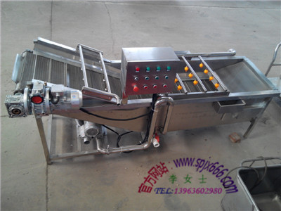 3、蔬菜漂洗機(jī):對(duì)蔬菜進(jìn)行二次的漂洗,可以達(dá)到蔬菜潔凈度,該機(jī)采用SUS304不銹鋼材質(zhì)制造,該機(jī)模擬手工清洗,通過(guò)鼓風(fēng)機(jī)將水達(dá)到翻騰的狀態(tài),蔬菜不直接接觸設(shè)備,在水中利用水的沖力,水槽上端設(shè)有噴淋裝置,可配合水的力度,將蔬菜清洗達(dá)到潔凈度,而且不傷害蔬菜表皮,達(dá)到客戶的需求,保持蔬菜的新鮮度。