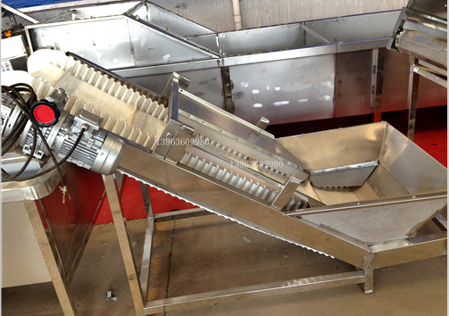 7、提升機(jī):通過(guò)振動(dòng)瀝水將大量的水滴去除掉,由提升機(jī)提升到下一道工序。傳送帶為PVC食品級(jí)材質(zhì),完全符合我國(guó)對(duì)食品衛(wèi)生的需求。