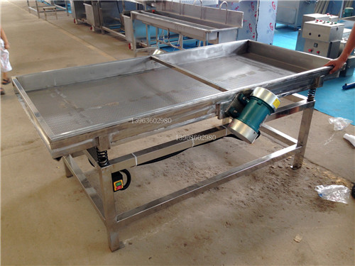 6、震動(dòng)瀝水機(jī):分切后的蔬菜帶有大量的水滴,通過(guò)震動(dòng)瀝水機(jī)將蔬菜大量的水滴去掉,該機(jī)根據(jù)蔬菜的品種可設(shè)計(jì)
