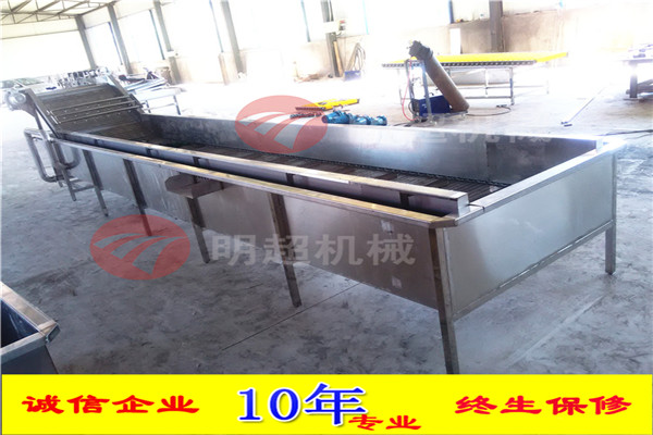 3. 清洗:根據所需清洗的蔬菜如果是葉類的可直接用翻浪式高壓氣泡清洗機清洗,如果是根莖類的蔬菜要先毛輥清洗機清洗去皮,然后進氣泡清洗機洗完后直接提升到下一步工序。