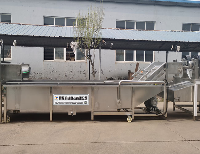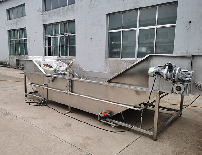 2.第二步清洗機(jī),主要通過水與氣體讓水產(chǎn)生鼓泡,雞鴨解凍后,需要清洗機(jī)清洗干凈表面的雜質(zhì),模擬手工清洗,不損傷產(chǎn)品,采用sus304食品級不銹鋼網(wǎng)帶輸送,清洗后的雞鴨,通過網(wǎng)帶輸送到下一步工序。減少人工操作,全自動化。